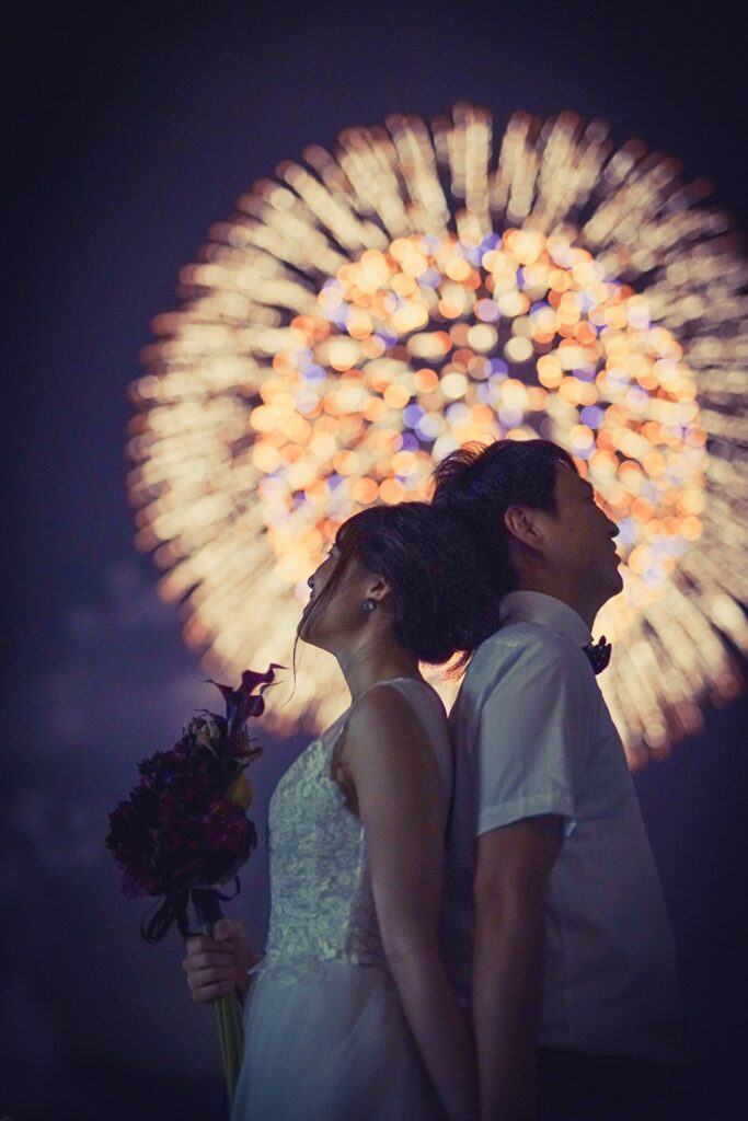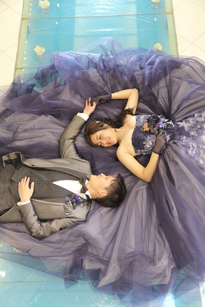 光の演出とともに新婦が歩む姿は、まるで水の上に浮かんでいるかのような美しさ。水のせせらぎが緊張を優しく解きほぐし、感動的なセレモニーを演出