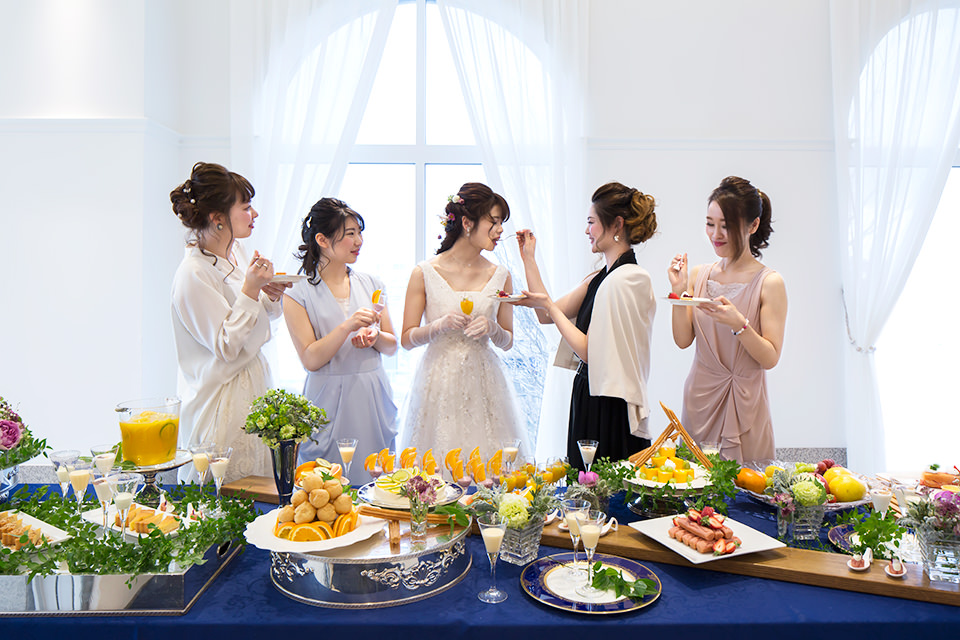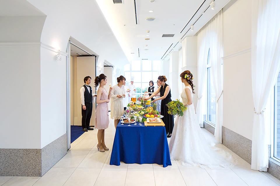 リニューアルしたメインバンケットは『Water Ring(水紋)』をテーマにしたスタイリッシュな空間。南欧を思わせる青と白を基調としたバンケットホールでたくさんの笑顔の輪に包まれるウェディングスタイル。